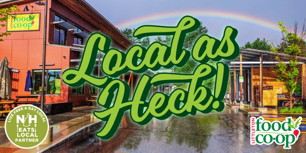 What is “Local”? Here at the Co-op, we include anything within a 100-mile radius, along with anything from NH or VT. We’ve organized our vendors by product and department, and grouped them so you can see our who’s who is local to Littleton Co-op. We also mapped out a 25-mile radius in green so you can see all of the super-local farms and producers in our region! Click here to see a full-size version of the map in a new page.